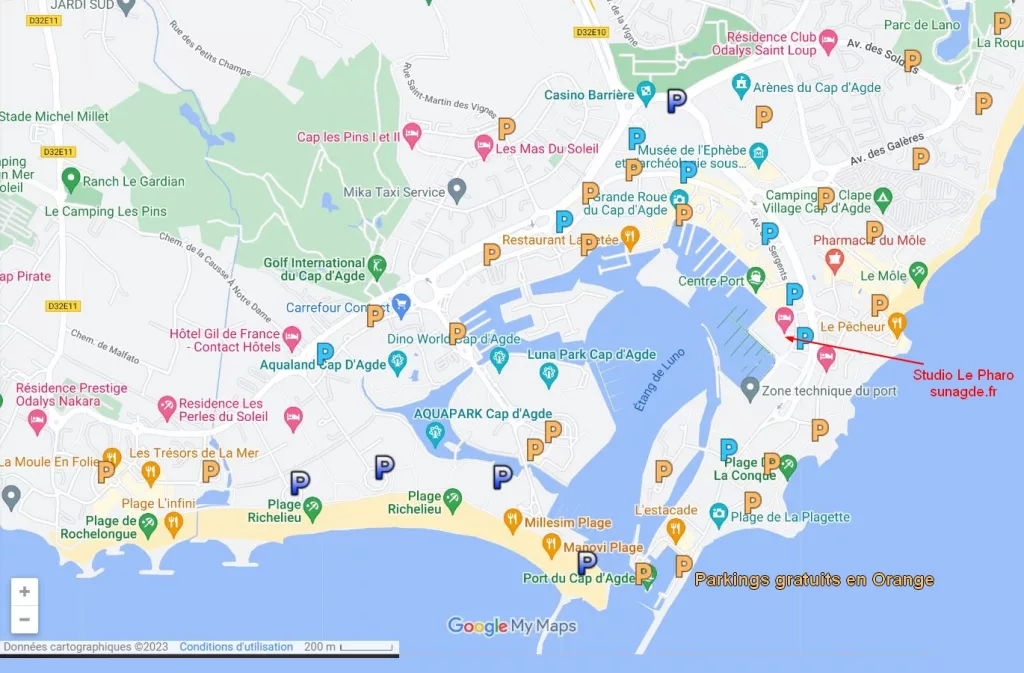 | Environnement proche | Plages du môle ou de la Falaise à 5 minutes à pied Parking payant devant la résidence. Parkings gatuits à moins de 500m. Grand Parking couvert gratuit du môle ou de la clape. Tous commerces a proximité. Arrêt Bus à 50 m Restaurants et shopping du Centre-port, Allée de la Flanerie. Casino Barière et Palais des Congrès à 10 min à pied. Golf international du Cap d’Agde |