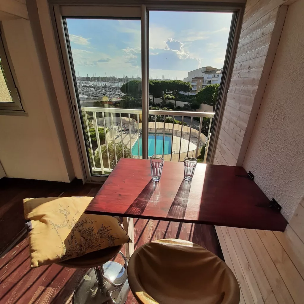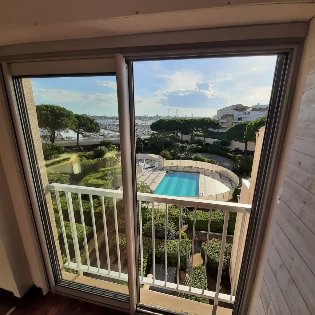 | Description intérieure Résidence surveillée en haute saison | Studio 22 m² au 4ème étage, desservi par ascenseur. Vue dégagée Sud-Ouest, sur Parc , Piscine et Bateaux du Centre-port Lit double en 140cm pour 2 personnes Kitchenette – Réfrigérateur porte ***, Senseo, Micro-ondes fonction Grill TV LCD |