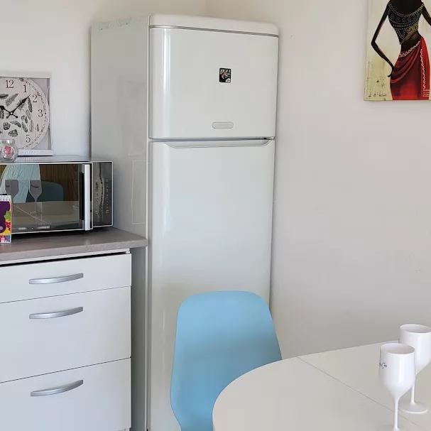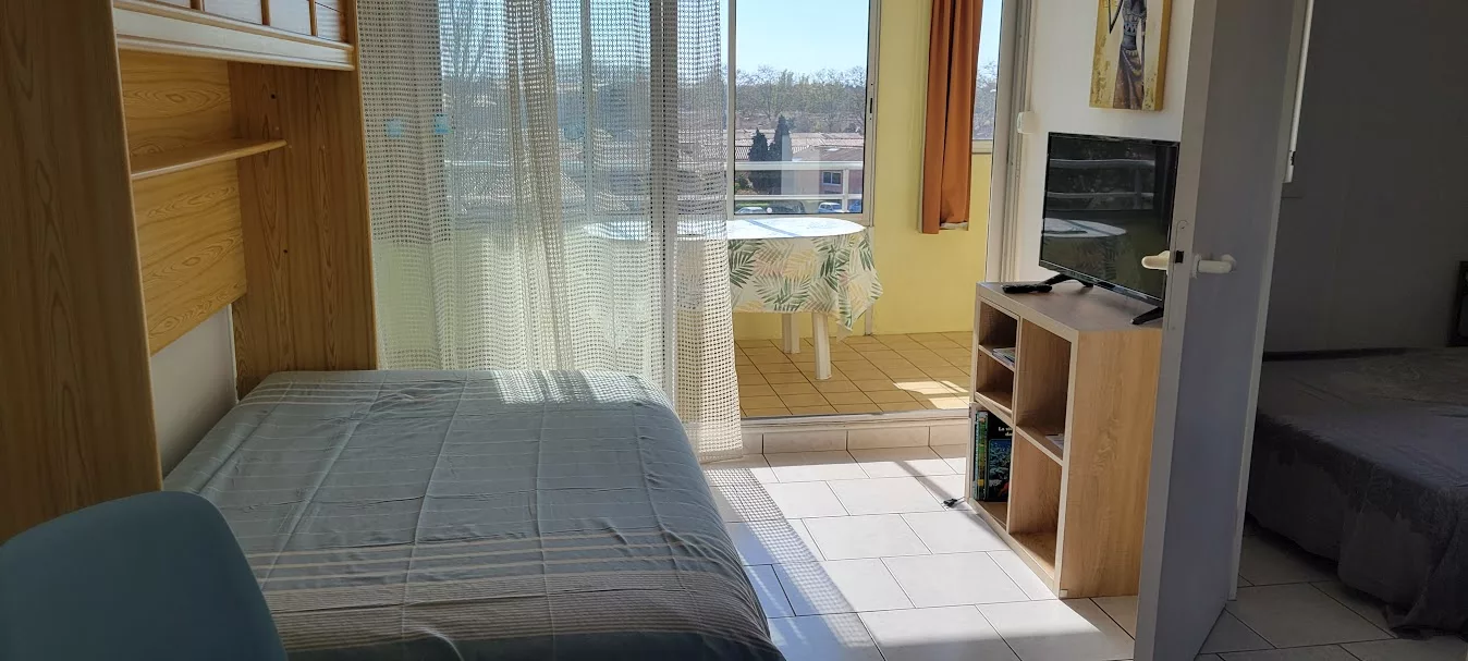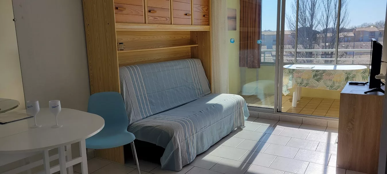 | Description intérieure Résidence surveillée en haute saison | Appartement 2 Pièces 26 m² + une Loggia de 11 m² Vue dégagée Sud-Ouest, 4ème étage, desservi par ascenseur Chambre avec 1 lit en 140cm pour 2 personnes Séjour avec un canapé convertible Clic Clac pour 2 personnes en 130cm Kitchenette – Four – Réfrigérateur-congelateur, Micro-ondes TV LCD Lave linge |