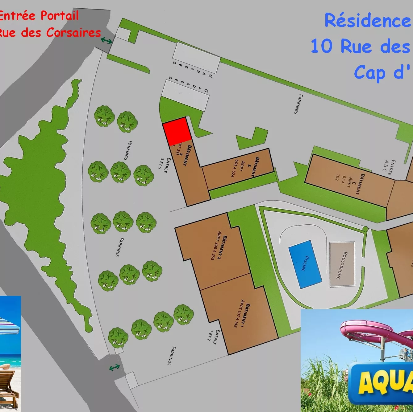| Description de l’extérieur | Piscine privée non surveillée dans la résidence Antinéa, Ouverture piscine prévue du 1er mai au 30 septembre. Terrain de pétanque Libre Parking dans la résidence fermée par portail automatique |